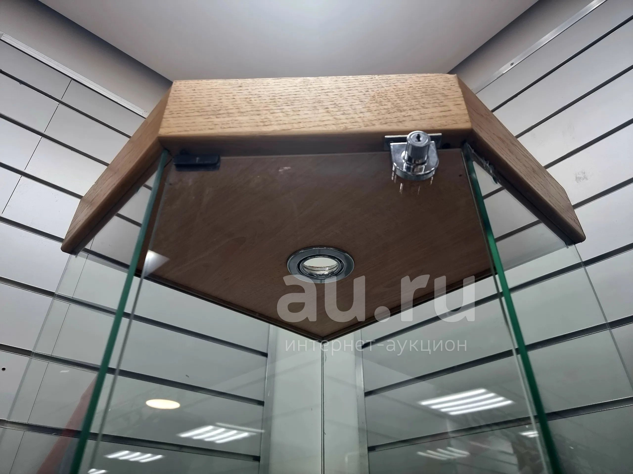 Стеллаж стеклянный высокий, угловой. Есть небольшой скол (на фото), на работоспособность не влияет, можно установить сверху подсветку, на дверце есть замок.