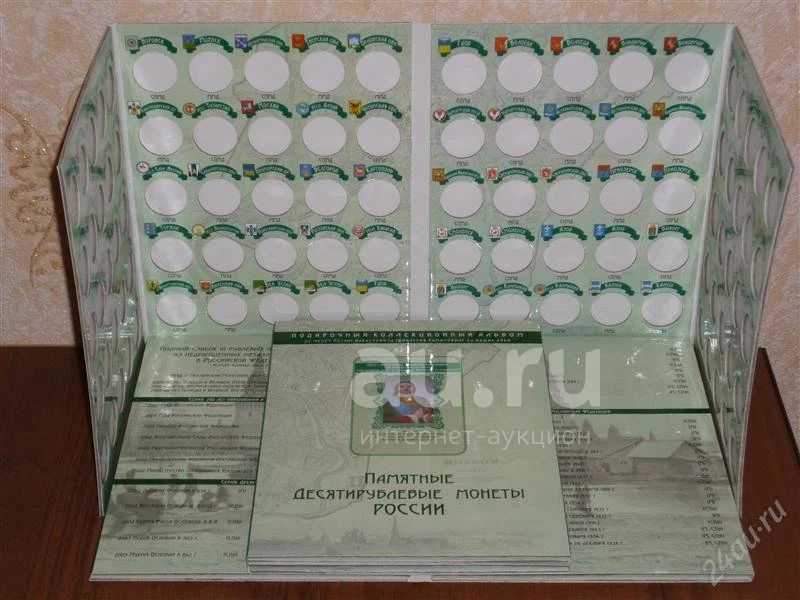 АЛЬБОМ для юбилейных монет 10 рублей.Альбом изготовлен из импортного книжного картона имеет ламинированную поверхность, поэтому позволяет плотно вставить монеты в соответствующие ячейки, с названием выпуска и монетного двора . Вместимость: 100 ячеек. Имеется запас для последующего выпуска монет. Альбом содержит информацию о истории образовании городов и областей.