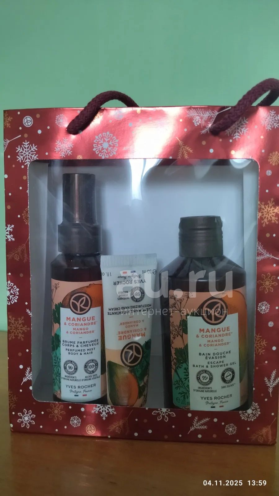 Ив Роше Новогодний подарок. Гель для Душа и Ванны + Увлажняющий Крем для Рук + Парфюмированный Спрей для Тела и Волос «Манго - Кориандр» + праздничная упаковка Yves Rocher