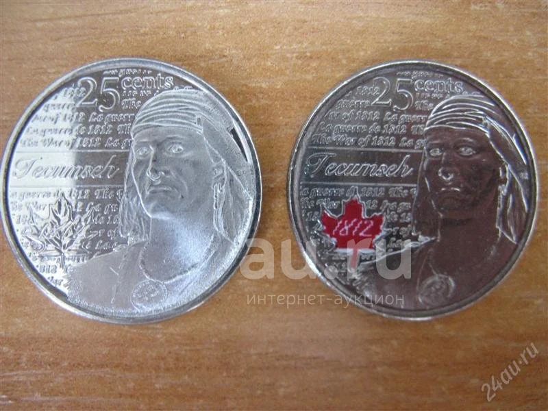 Канада 25 центов 2012 года. Индейский вождь Текумсе. 2 монеты: простая + эмаль. Новые.