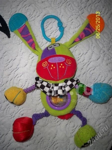 Увлекательная игрушка с целой кучей развивающих элементов - погремушка, пищалка, шуршалки, зеркало, прорезыватели, использованы различные материалы и ткани. Можно подвешивать на кроватку/коляску/коврик или играть просто так. Состояние отличное.