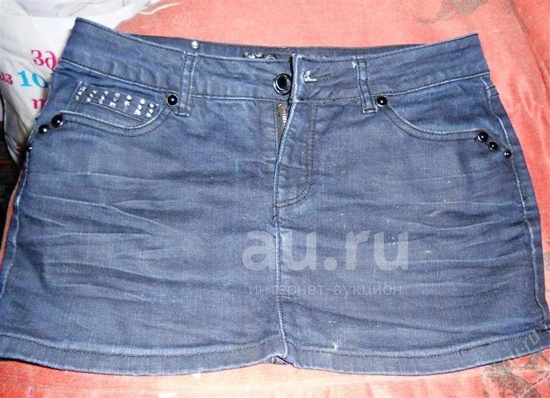 Красивая джинсовая (чисто джинс, не стрейч)коротенькая юбочка с отделкой стразами на карманах. Размер L. Цвет темно-синий, на фото ярче