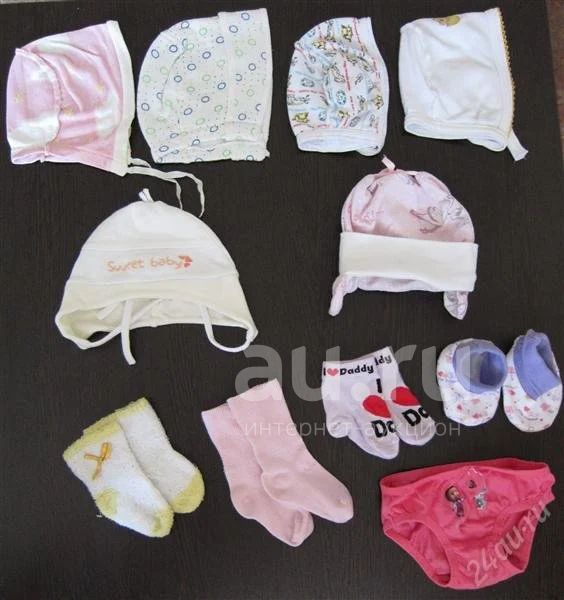 Одежда для дома:6 чепчиков, 3 пары носков, 1 пинетки, 1 плавочки. От 0 до 6 мес.