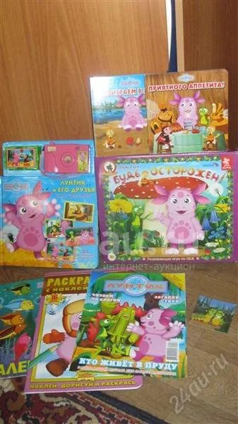 Все про Лунтика: игра настольная "Будь осторожен" (в отличном состоянии), раскраска с наклейками (несколько стр. использовано), журнал и 3 книги с твердыми стр. в отличном состоянии (но в большой: карточки погнуты и из фотоаппарата соответственно не выскакивают + пара карточек утеряны), мал.пазлы, календарь Природы (предназначен для ежедневного использования, рассчитан до 2016г. вкл.), календарь перекидной (старый, но с крупными красочными картинками). Бонусом, если нужно кому, отдам интерьерные наклейки "Декоретто" "Лунтик с друзьями" многоразового использования (б/у).