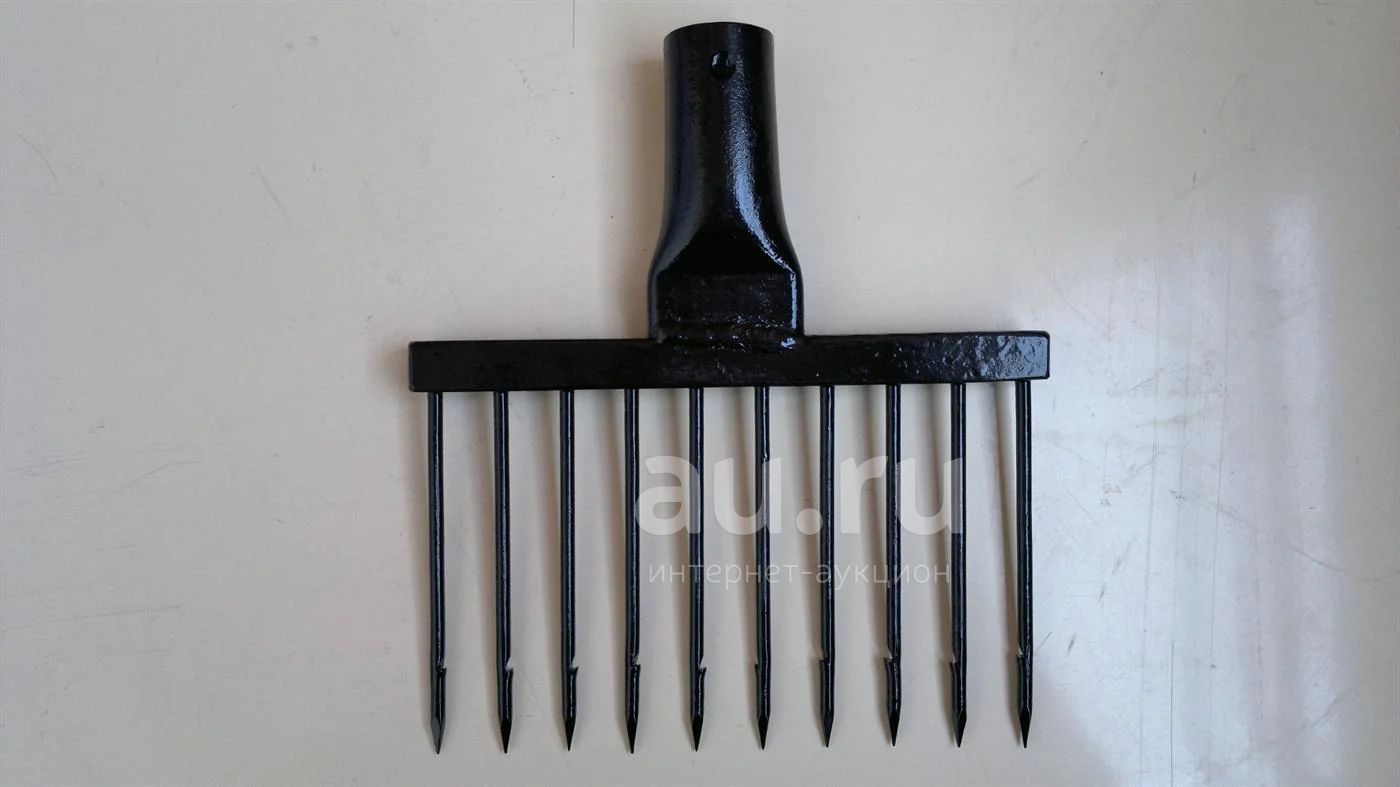 Зубья остроги изготовлены из пружины диаметром 5 мм. Длина зубьев 115 мм , расстояние между ними 15 мм.Тулейка под черенок 27 мм. Зубья завальцованы и проварены электросваркой.