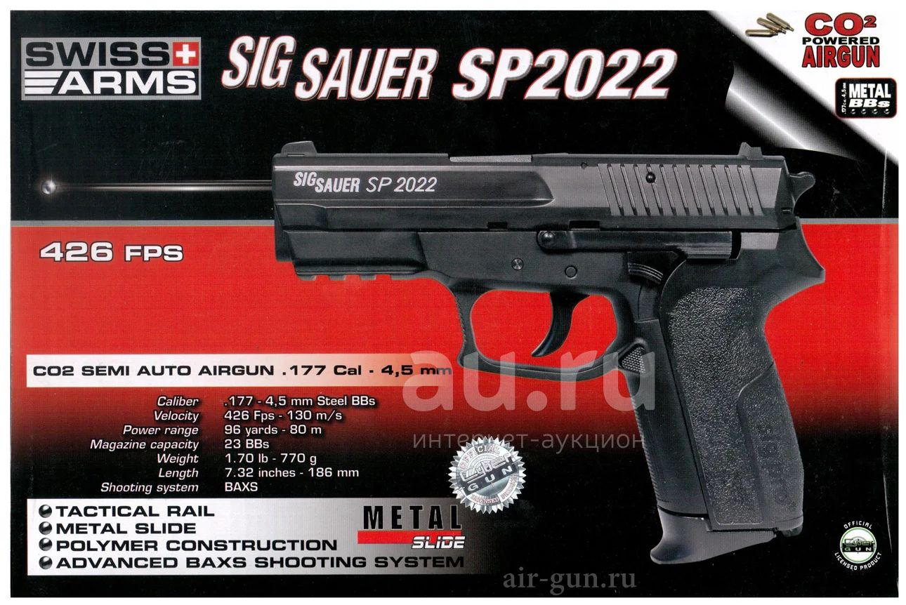 Swiss Arms SIG SP2022 Black - реплика одноименного боевого пистолета, разработанного в компании Sig-Sauer как замену пистолету P229. Затвор и магазин у Swiss Arms SIG SP2022 Black выполнены из металлического сплава, рамка из ударопрочного пластика. Пистолет имеет планку Вивера для различных аксессуаров, и удобный предохранитель прямо под большим пальцем. Поскольку это бюджетная модель, затвор неподвижен, а курок - подпружиненный муляж. Однако, пистолет для своих небольших габаритов обладает очень высокими показателями емкости магазин и начальной скорости шарика.