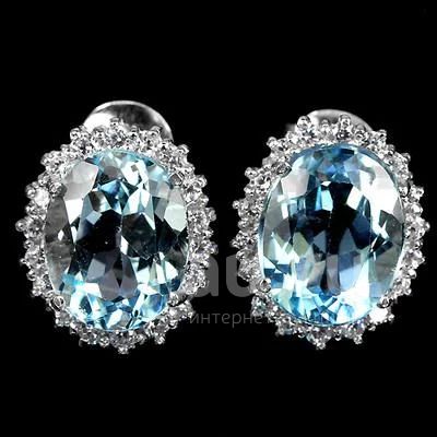 СЕРЬГИ ВЫПОЛНЕНЫ ИЗ СЕРЕБРА 925. ПОКРЫТЫ БЕЛОЙ ПОЗОЛОТОЙ. ВСТАВКА - НАТУРАЛЬНЫЙ ГОЛУБОЙ ТОПАЗ (10,0 мм х 8,0 мм), белые сапфиры (1,5 мм)