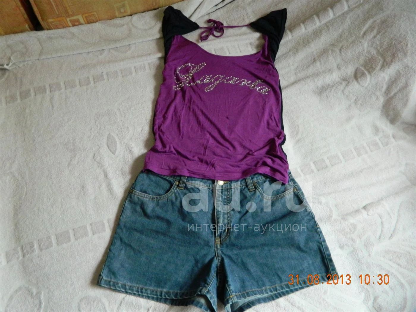 Шорты в отличном состоянии,маечка в удовлетворительном(имеются спереди малюсенькие дырочки),можно приклеить 3 стразика и все в порядке.У маечки спинка полностью открыта,что смотрится очень классно.