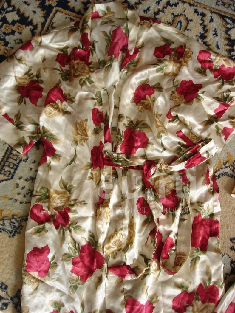 Атласный халатик с шортиками и маечкой. На халате есть дырка по шву-не критично можно легко зашить-на третьем фото видно.