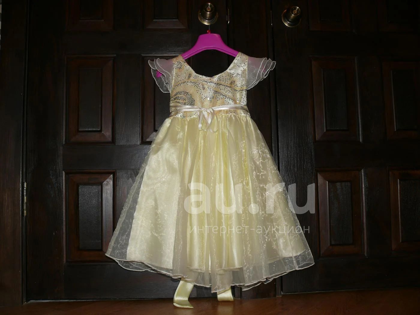 Желтое нарядное платьице для принцессы. Верх обшит паетками, завязывается на пояс, юбка многослойная солнце.
