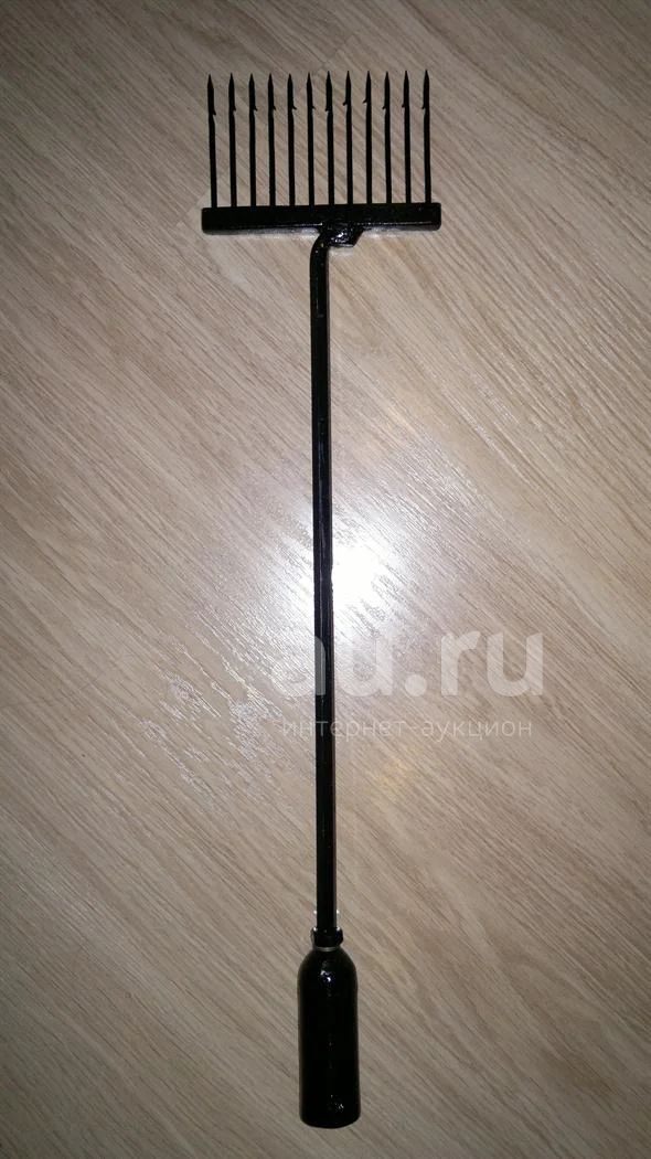 Зубья остроги изготовлены из пружины 3.5 мм.Длина зубьев 75 мм , расстояние между ними 7.5 мм.Тулейка под черенок 27 мм.Длина остроги 570 мм.Ширина остроги 135 мм.Зубья завальцованы и проварены электросваркой.Острога разборная ( тулейка откручивается ).