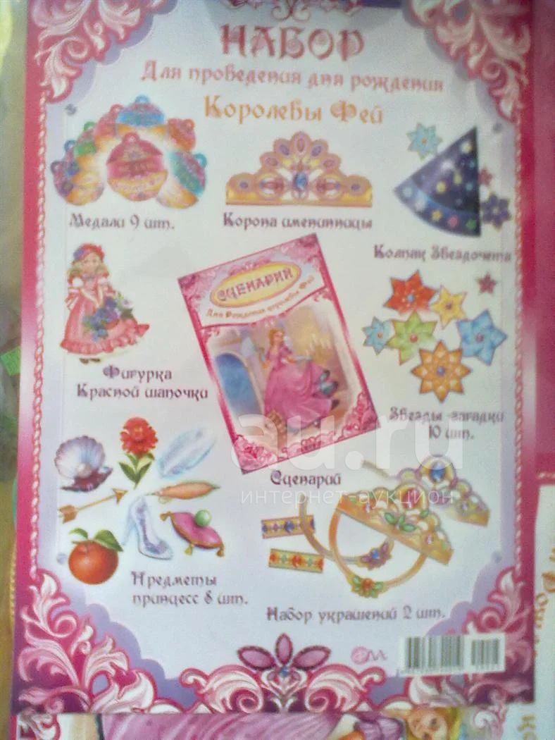 В набор входит: сценарий, медали 9шт., корона именинницы, колпак звездочета, фигурка красной шапочки, звезды-загадки 10шт., предметы принцесс 7шт., набор украшений 2шт.