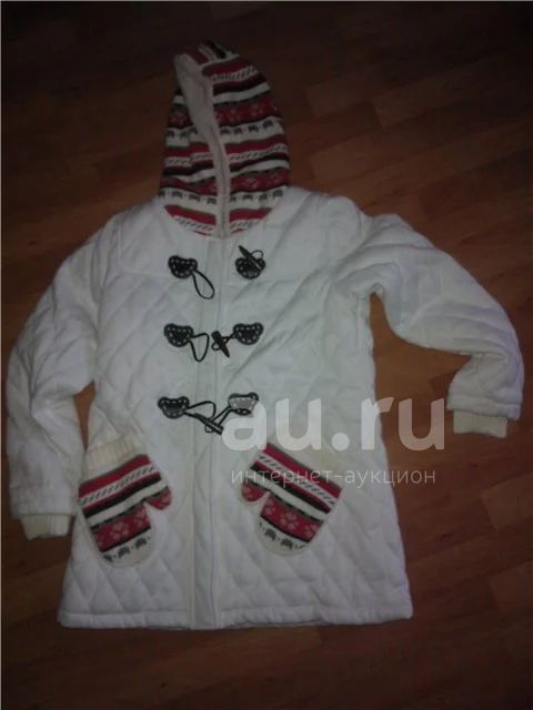 Теплый,уютный жакет для прохладной погоды. Цвет белый стёганый, удлинённый, на синтепоне с деревянными пуговицами в виде клыка с вязаными карманами и капюшоном.