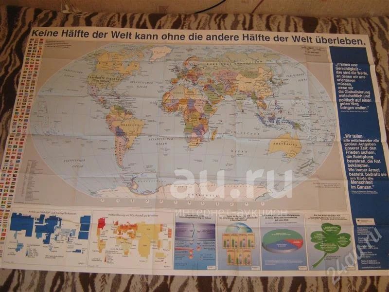 Карта мира на немецком языке.Размеры 96см.x 137см.Масштаб 1:33000000.Из Германии.
