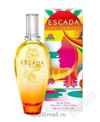 Эта композиция многим кажется похожей на «Полуночную фантазию» от Бритни Спирс. Но у аромата Эскады чуть больше «тропических» нот, навевающих мысли о роскошном острове, затерянном где-то в океане. Доминирует манго, ярко выделяются ананас и апельсин. В формуле также присутствуют нектарин, водные цветы, малина, малайское яблоко. Обрамлением служат кокос, сандал и мускус. Ягодная сладость, похожая на жвачку, есть во многих ароматах Escada, например, Island Kiss. Парфюм Escada - Taj Sunset посвящен прекрасному месту – Гоа, в котором собраны все ноты экзотических фруктов и цветов. Обладательница этого аромата способна окунуться в волну нежности и любви, окутанную потаенной страстью. Флакон в ярких красках украшен знаменитым индийским цветком – лотосом, что наделяет его магическим действием, давая возможность перенестись в прекрасные экзотические места в нахлынувших фантазиях. Нектарин, манго и апельсин составляют верхние ноты аромата, приближая к его сердцу – коктейлю их яблоки и малины открываясь шлейфом из смеси сандала, мускуса и кокоса. НЕ ЖДИТЕ КОНЦА ТОРГОВ, ЧАСТО ЗАКАНЧИВАЮ ДОСРОЧНО!