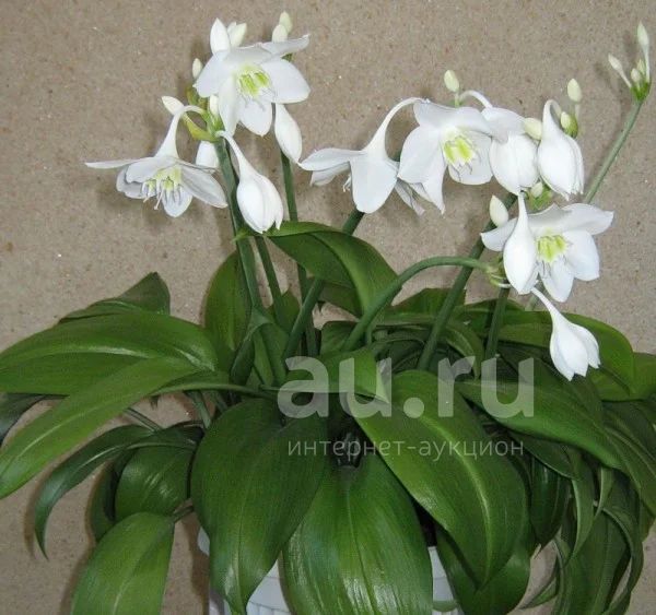 Эухарис (амазонская лилия).Цветки диаметром до 10 см, похожие на нарцисс, ароматные белые, на длинном цветоносе, по 4–6 в соцветии, собраны в зонтиковидное соцветие. При соответствующем уходе растение может цвести дважды в год (как правило нужно только поливать и протирать листья).Не прихотливое.У меня цветет в ноябре и через пол года.Рекомендуется в горшке оставлять несколько деток,будет лучше и быстрее цвести.