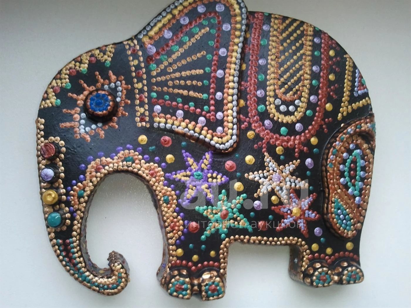 Слоник сувенирный, подарочный. Сделан из гипса. Раскрашен акриловыми контурами. Имеется петелька для подвешивания на стену. Во многих странах является талисманом удачи и процветания.Размер 13*11см.