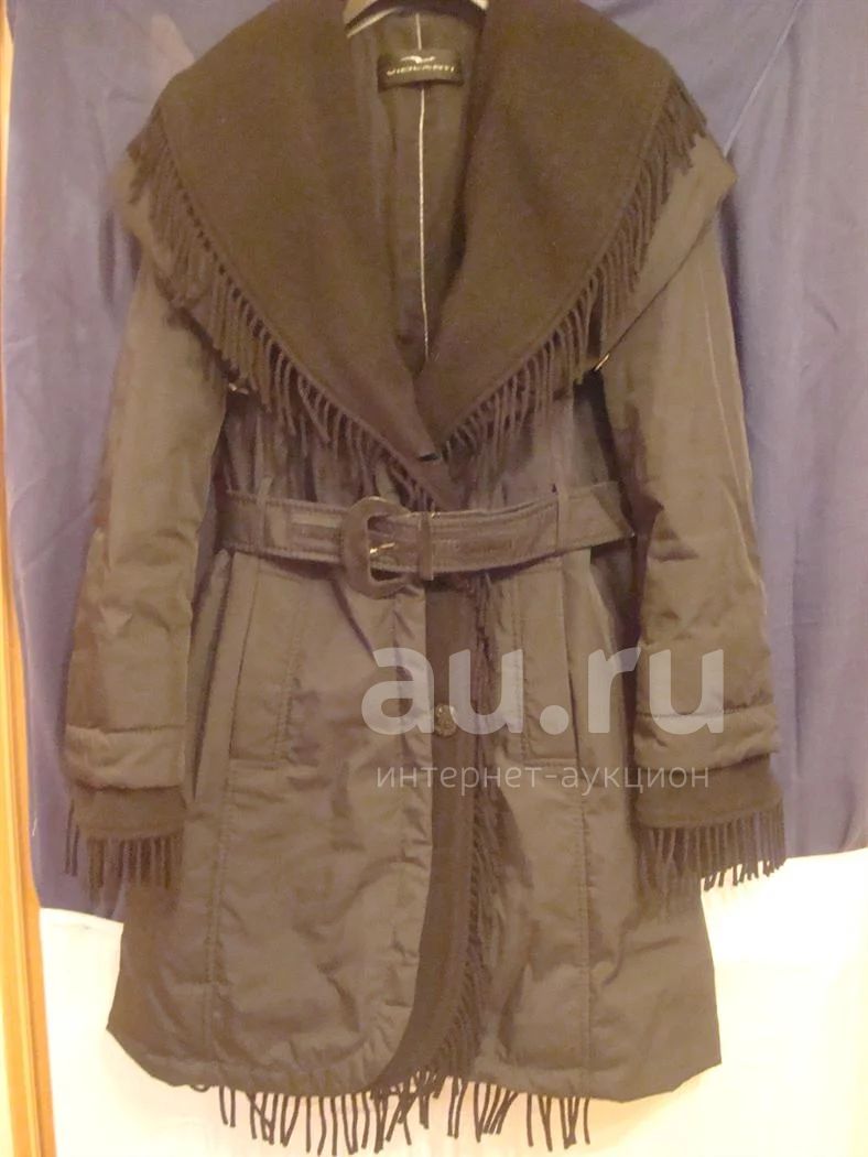 Черный, приталенный, на ремне замшевые вставки, воротник и окантовка – 100% шерсть, затягивается по низу и по воротнику. Есть фирменная вешалка.