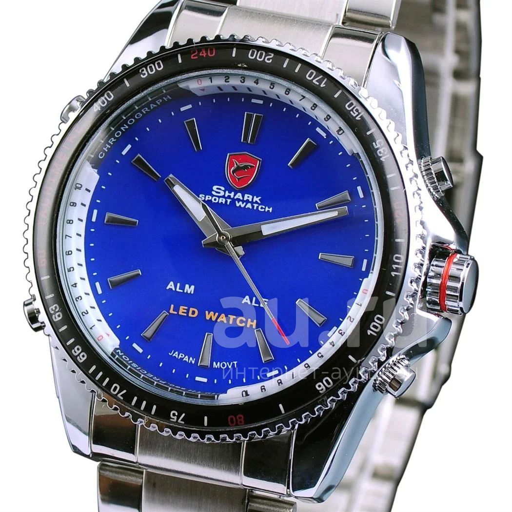 Новые спортивные бинарные часы фирмы Shark с синим циферблатом. Дизайн данных часов разработан известными японскими дизайнерами.