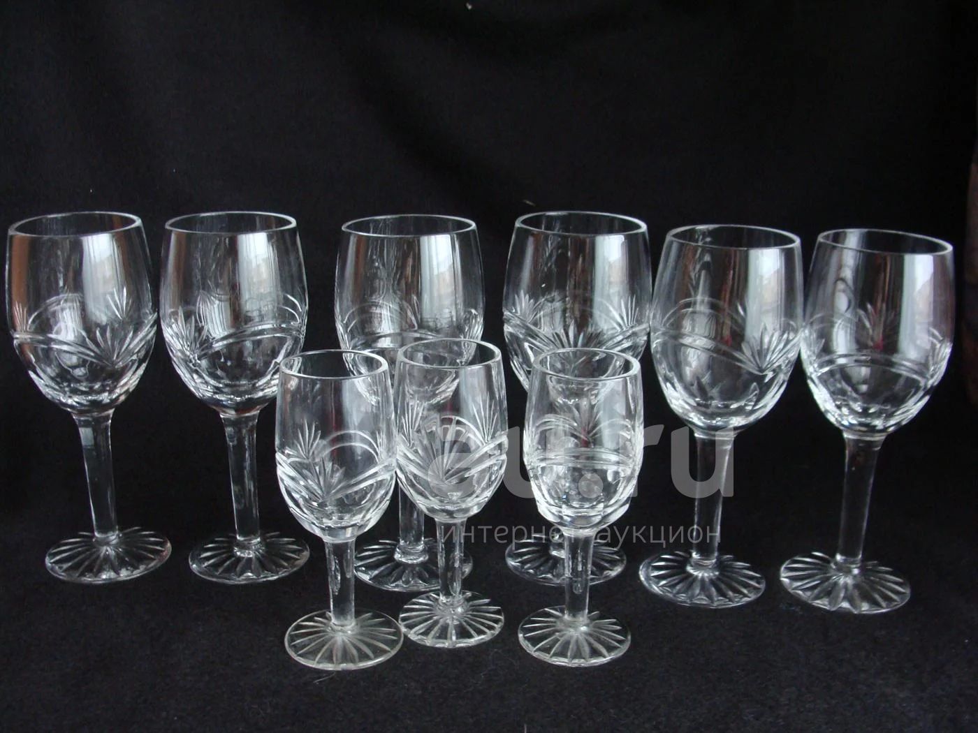 Набор из хрустальных бокалов, большие - 6 штук, маленькие - 3 штуки. Цена за бокал 35 рублей. Можно покупать в любом наборе. Большой: высота - 16 см, диаметр - 5,5 см, маленький: высота - 12 см, диаметр - 4 см.