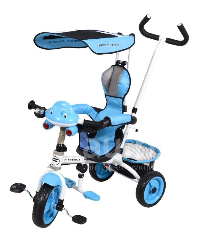 Велосипед детский оснащен защитным тентом от дождя и солнца, ручкой управления, а так же имеет страховочный обод, задний багажник, складная подставка для ног.