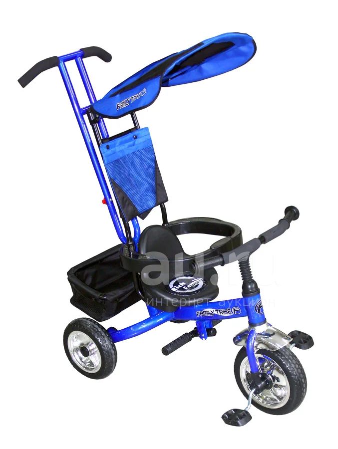 Детский трехколесный велосипед TRIKE сиденье удобное с поддерживающей спинкой для комфортной посадки, сзади расположена багажная корзина для игрушек, складная подножка, разъемный страховочный обод, зонтик с козырьком, сумочка для мелочей, родительская ручка управления. Цвет синий.