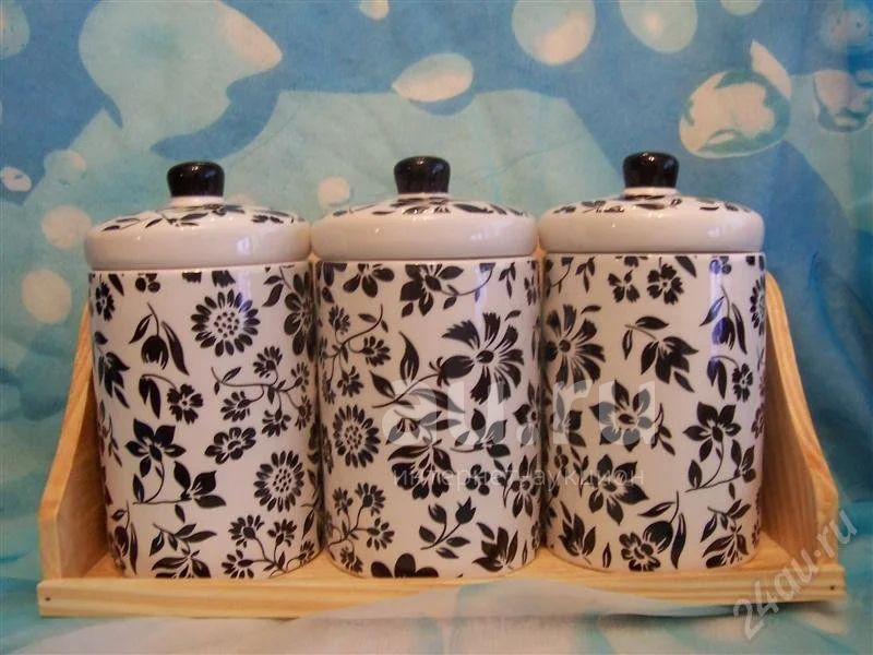 Набор банок (3 шт.) на деревянной подставке. Керамика. Объем каждой 400 мл.