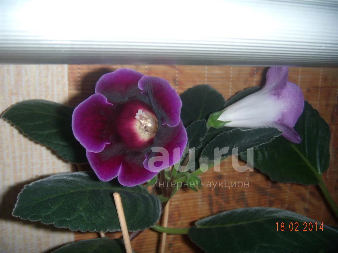 Цветущая глоксиния синего цвета. Горшок - пластиковый стакан.
