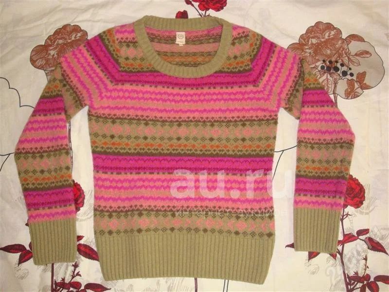 кофта отличного качества, теплая, не закатывается. размер 42-44, но может и на 46 пойдет. круглый вырез, отлично смотрится поверх однотонной рубашки (чтобы воротничок торчал).