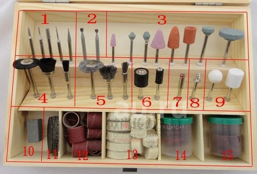 набор насадок для гравера. Диаметр 3 мм. В комплекте, полировальная паста, различные фрезы, боры. Новое. В деревянном ящике.