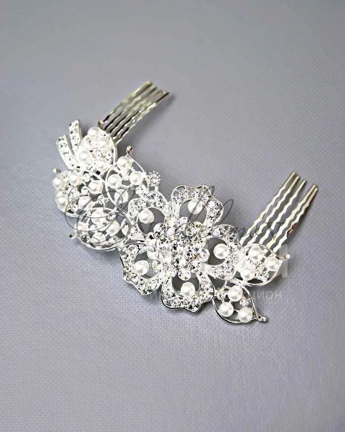 Свадебное украшение Milena от Свадебнов - Серебряный гребень, усыпанный искусственным жемчугом и кристаллами