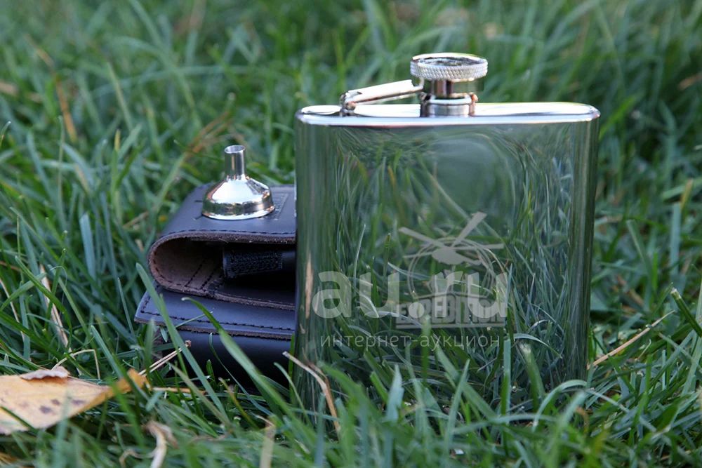 Фляжка "Экспедиция" в кожаном чехле, 190 мл для алкогольных напитков из нержавеющей стали с пищевым покрытием, убирается в кожаный чехол с карманом для сигарет и зажигалки, крепится на ремень.