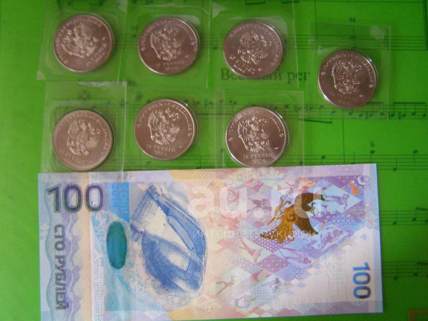 25 рублей 2011, 2012, 2013, 2014, олимпиада Сочи, горы , талисманы, лучик и снежинка, факел, все 7 шт + купюра 100 рублей