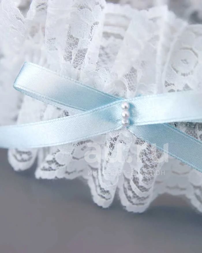 Легкая подвязка с нежно голубым бантом с дополнением искусственных жемчужин.