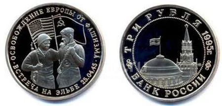3 рубля 1995 год. Встреча на Эльбе. Состояние!!! Эльба.