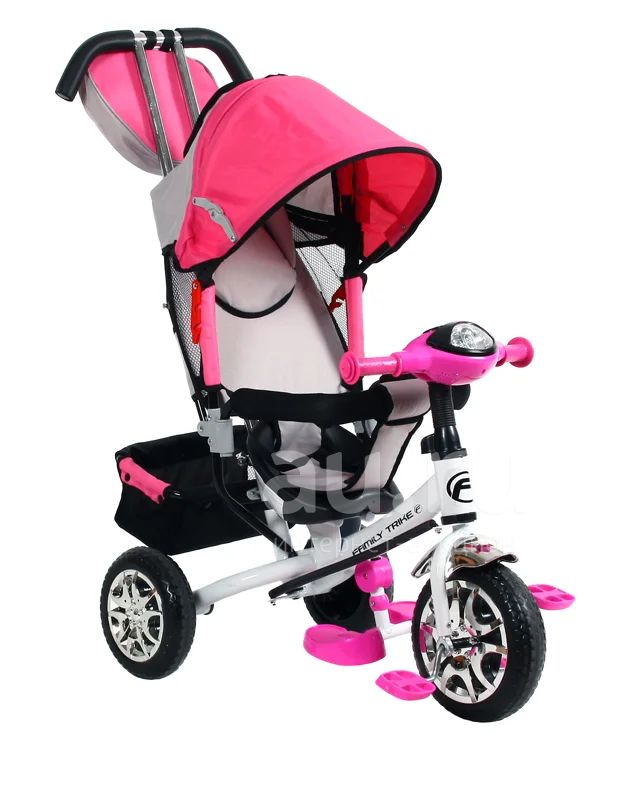 Велосипед 3-х кол с диаметром колес 8" и 10" дюймов, материал: пвх, резина, рама сталь, хромированные крылья, педали: пластик, сидение со спинкой, подгузник, два положения спинки, багажная корзина, колясочная крыша, смотровое окно, двойная ручка управления, подножка складная, мягкий подголовник, разъемный мягкий страховочный обод, сумочка для мелочей, глубокий козырек, звонок.