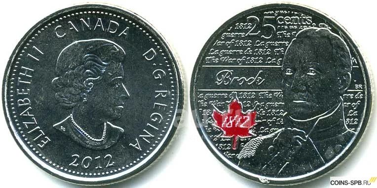 Монета 25 центов. Канада. 2012г.Герои Англо-американской войны 1812г. Сэр Айзек Брок.Эмаль.