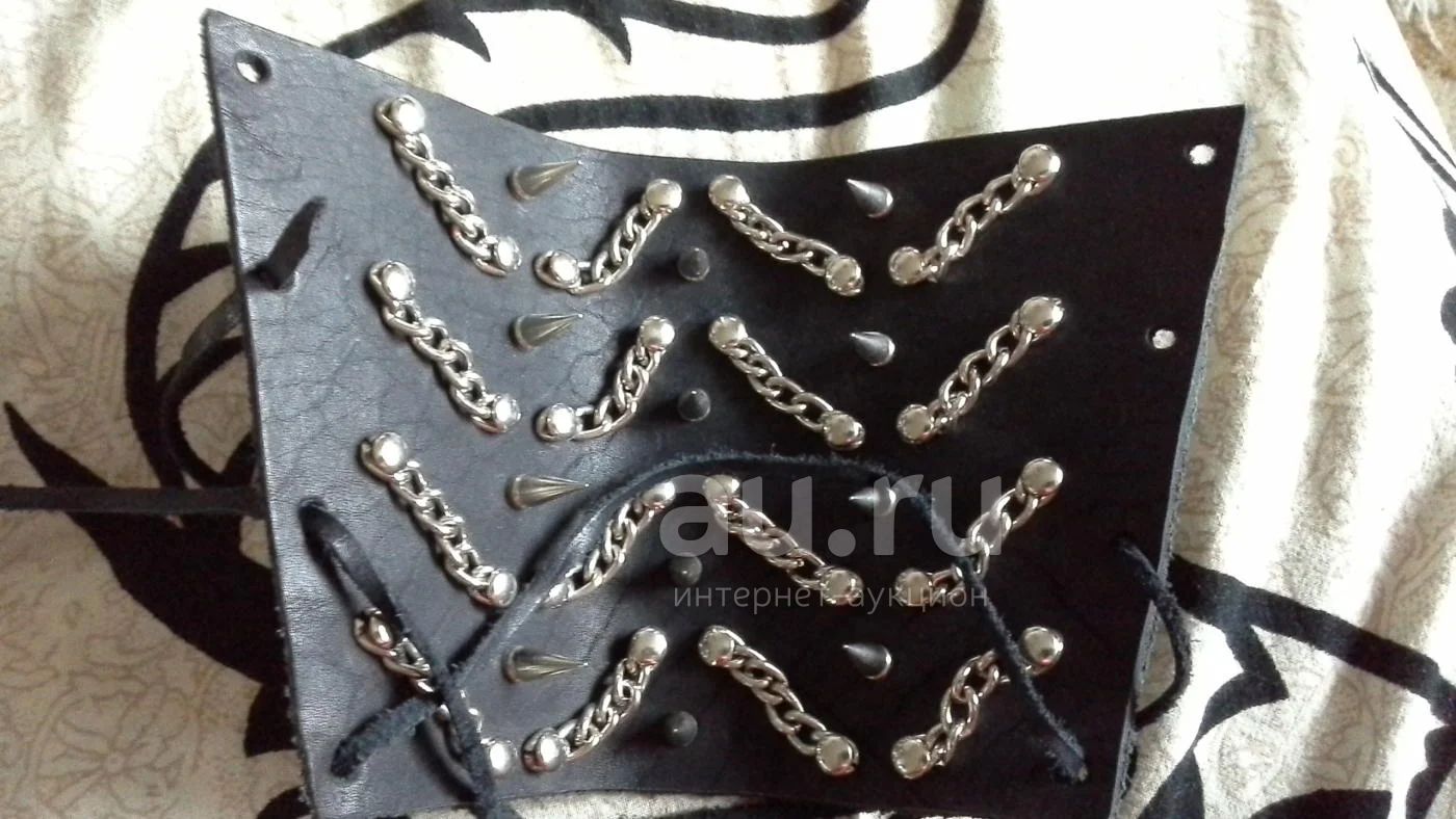 Наруч кожаный с шипами и цепями. Длина 14 см., ширина по верхнему краю 23 см, по нижнему - 17,5см.Шнурок для завязывния кожаны - 139,5 см.