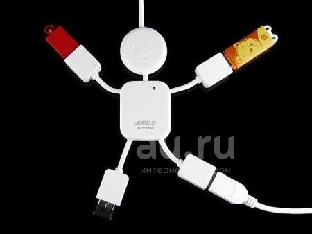 USB разветвитель в виде улыбчивого человечка , на руках и ногах которого находятся USB разъемы. Устройство выполненого из прочного глянцевого пластика белого цвета. Размеры : Упаковка: 21 * 10 см, изделие: 14 * 14 см. Длина кабеля: 57.5cm Материал: USB + ПВХ Вес продукта: 68 г