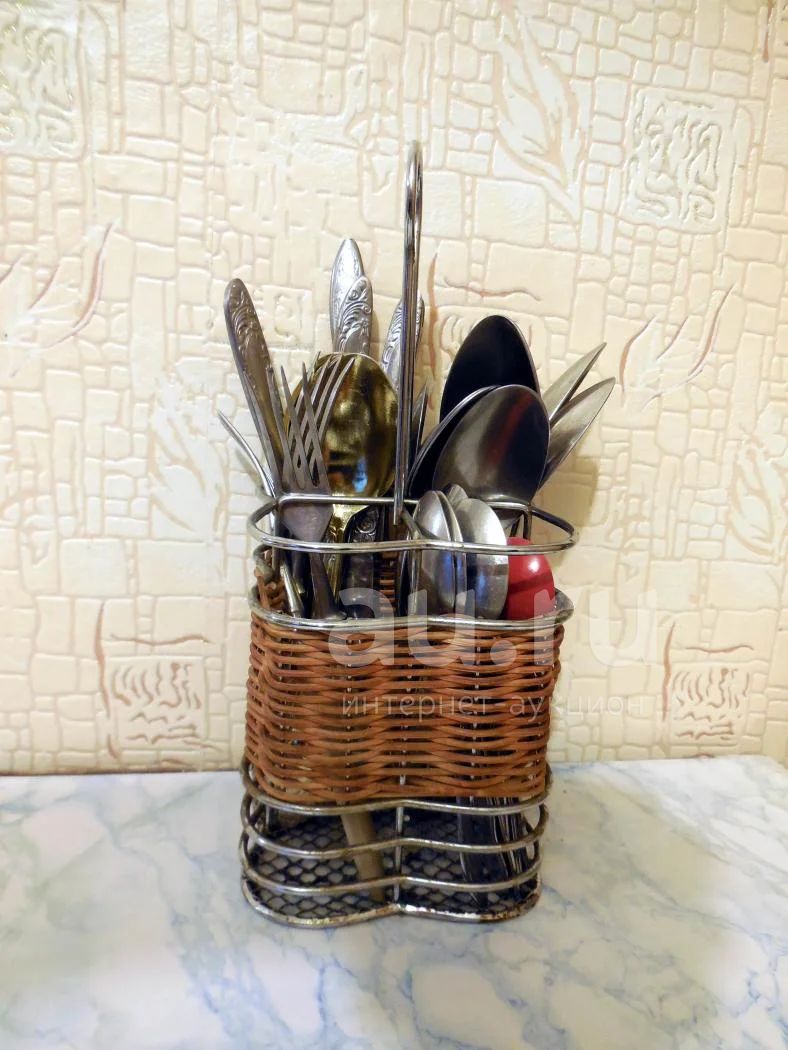 Там и чайные, и десертные, и столовые ложки. Вилки. Ножи. Подставка металлическая, с ручкой.
