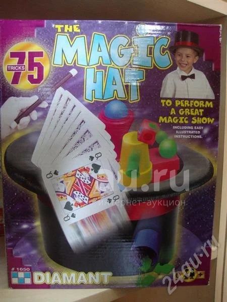 Спецификация: шляпа, шнурок, магическая палочка, 3 стаканчика,2 кубика, 33 карты, веревка, лопаточка, колпак, шарики, формочки, ленточка, 2 надувных шара, лоскуток ткани, 4 кролика, 2 наперстка