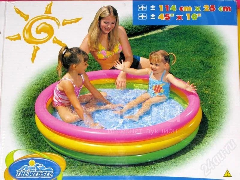 Бассейн надувной для детей 3 лет и старше. Диаметр - 114 см, высота - 25 см. Водонаполняемость - 200 литров. Имеет три отдельно надувающихся борта и дно, каждый из которых снабжён двойным клапаном для предотвращения случайного сдувания. Может надуваться как ртом (при использовании соломинки или спички), так и специализированным насосом. Порядок надувания - сначала борта, начиная снизу, затем дно.