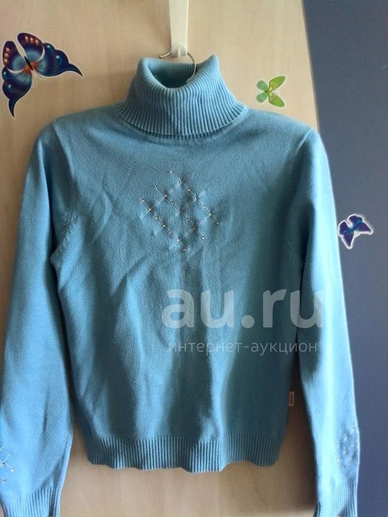 Свитер голубой,тоненький,украшен узором из страз на груди и рукавах,рост указан 160