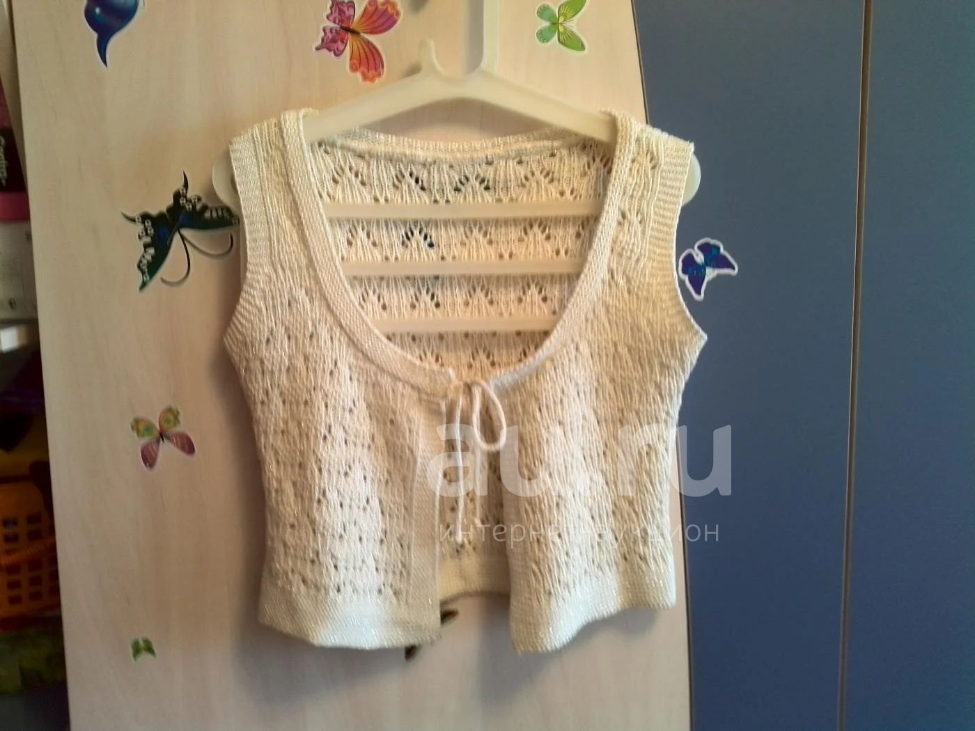 Белый жилетик из хлопковой пряжи с люрексом,на завязках впереди,носили при росте 152см в школу
