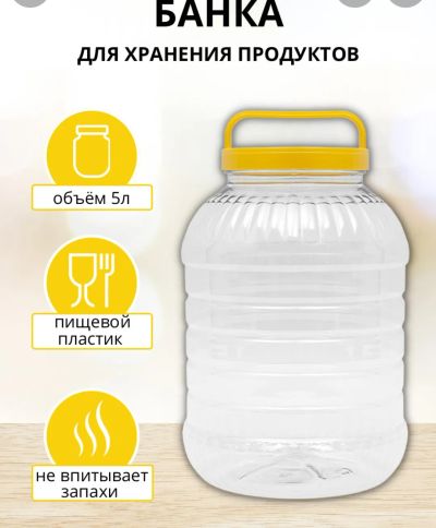 200 руб.Банка пэт с герметичной крышкой с ручкой. Объем 5 литров.