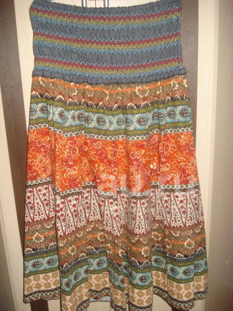 Юбочка на резинке, необычной расцветки, смотрится хорошо. К ней есть топик (смотрите в моих лотах). В не растянутом виде в талии она 68, тянется хорошо, так что и на 46 размер пойдет, а дальше она расклешенная, так что ОБ не имеет особого значения.