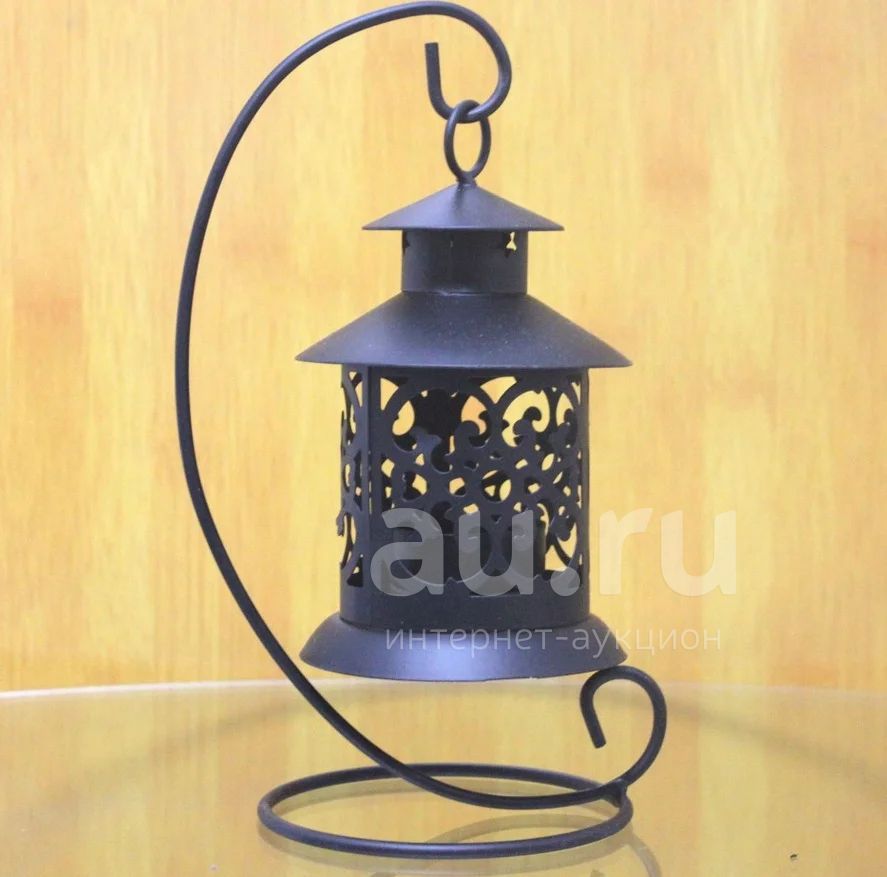 Материал - железо. Размеры вместе с подставкой - 21*10 см, размеры фонаря 14,5*8,5 см.