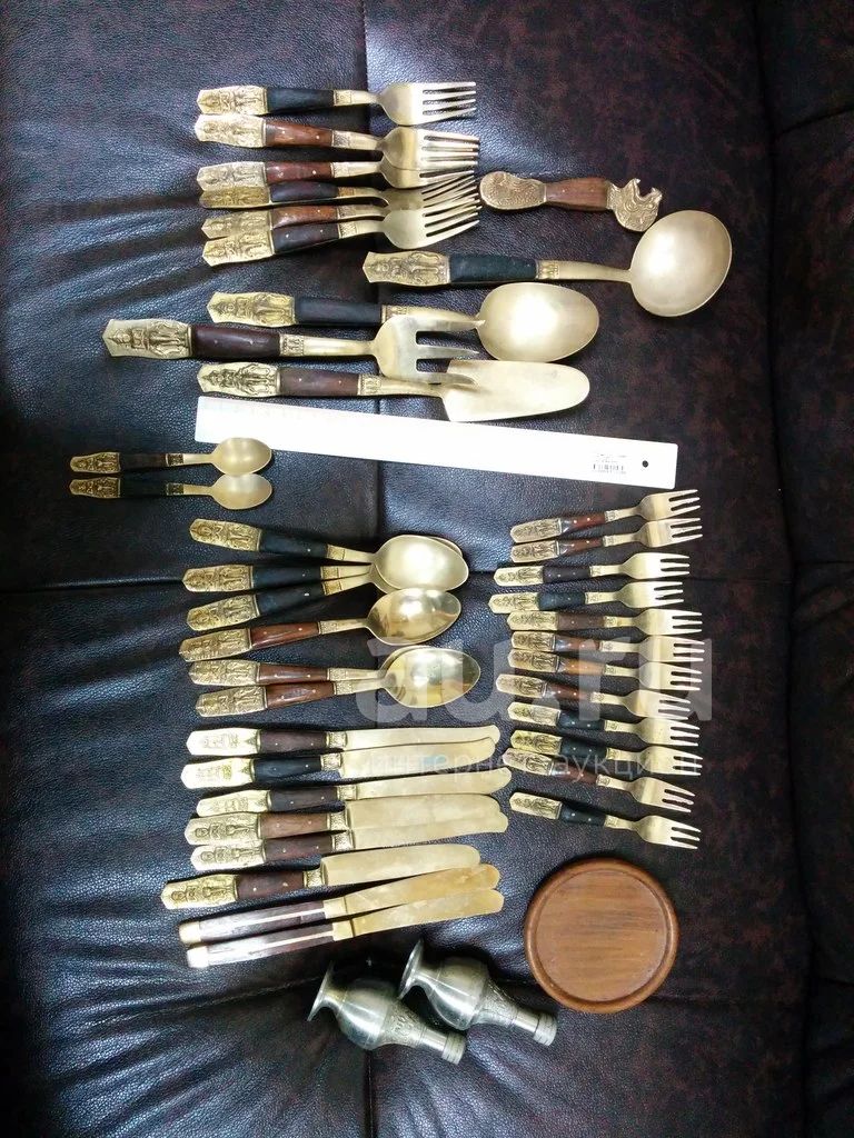 Все что на фотографии комплектом за 1700 руб. Кроме солонки с перечницей все вроде ручной работы, из металла желтоватого цвета вставками на ручках из древесины. Лежали в шкафу лет 5) Немного подчистить и состояние будет просто отличным)))