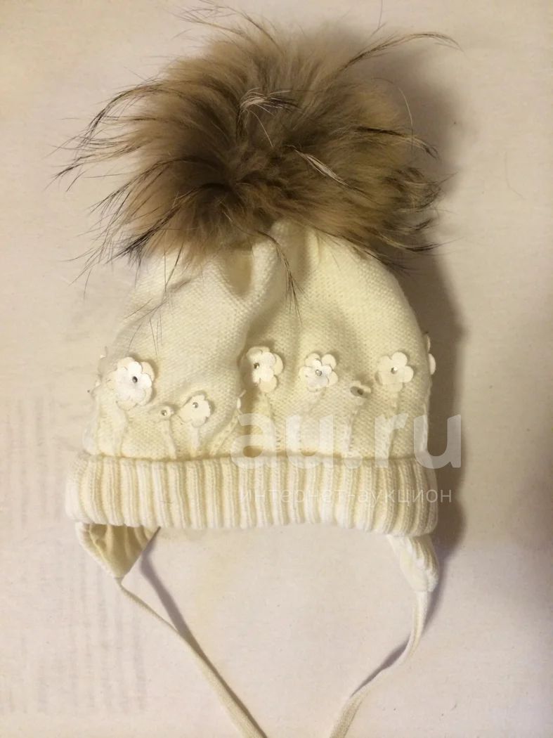Симпатичная шапочка, утепленная, внутри слой изософта. размер 44-46, носили до 1,3 года. Пампон из натурального меха (енот), снимается можно стирать отдельно шапку. Брали к зимнему комплекту, см. также в моих лотах. Цвет бело-молочный