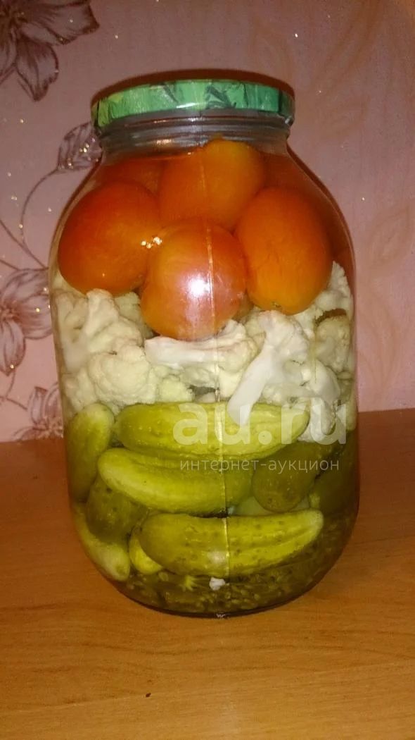 Ассорти - помидоры, цветная капуста, огурцы ( "Раздолье" ), очень вкусное. Баночка 3 литра - 250р.
